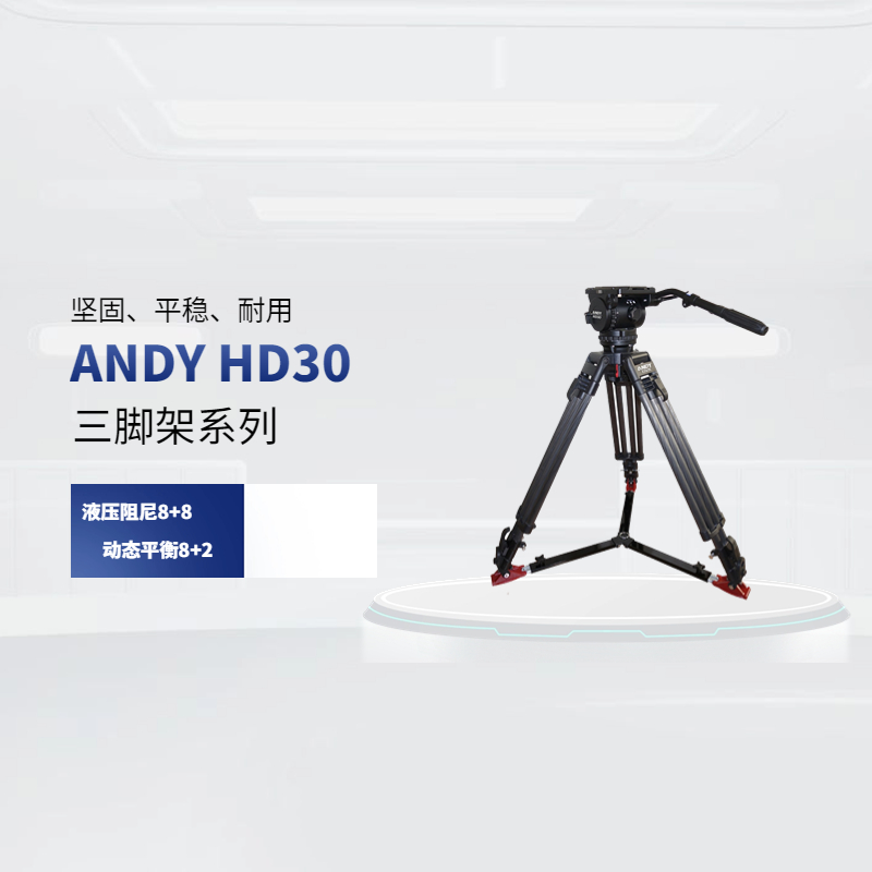 ANDY HD30云台自重6.5kg,配有100mm球碗底座和双伸缩手柄。可搭配两级镁合金和碳纤维三脚架使用。特别适合演播室电视节目制作、摄影棚广告拍摄等环境中使用。