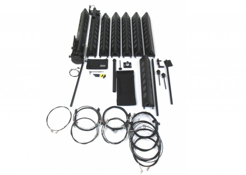 TRIANGLE PRO SUPER 系统套装,7.6 米摄高、5.4 米前臂长,全臂长 8 米,套装包括:臂杆、钢索、重型三角架、电控系统(遥控云台、佳能镜头(8 针)控制配件、控制盒、电池盒、聚焦/变焦/光圈控制手柄、云台控制手柄、水平(垂直)控制马达集成、控制电缆,三轮车架及三轮路面车轮(含运输箱不含配重及监视器)